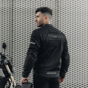 Kurtkę motocyklową DART zaprojektowano z myślą o wygodzie. Duże panele mesh z przodu, z tyłu oraz na rękawach gwarantują doskonałą cyrkulację powietrza i odprowadzanie wilgoci, dzięki czemu kurtka idealnie sprawdzi się w upalne dni. Na barkach i łokciach ma certyfikowane ochraniacze CE-Level 1. Jest regulowana na biodrach i w rękawach. Dodatkowym plusem kurtki są pojemne kieszenie.
