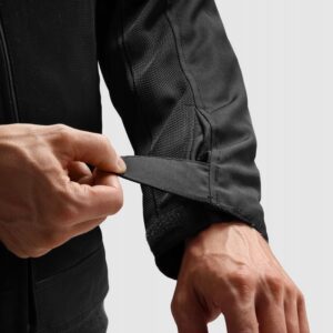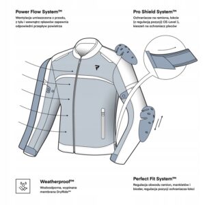 Kurtka posiada liczne opcje regulacji, które umożliwiają dopasowanie do sylwetki i poprawiają ergonomię podczas jazdy.