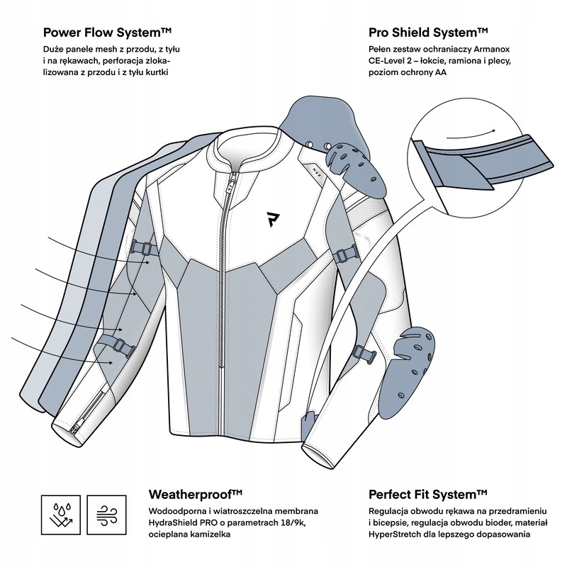 Kurtka Rebelhorn Hiflow V wyposażona jest w ochraniacze Armanox na łokciach, barkach i plecach oraz spełnia wymaganianormy CE na poziomie AA. Ochraniacze łokci mają regulowaną pozycję, co pozwala na idealne dopasowanie.