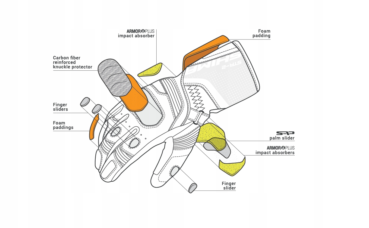 STR-2 to motocyklowe rękawice o sportowo-miejskim charakterze. Wykonane z miękkiej, koziej skóry wyposażone są w konstrukcję z wstępnie zakrzywionymi palcami oraz liczne elastyczne panele na dłoniach i palcach, które pozwalają na dostosowanie się do ruchów dłoni podczas prowadzenia motocykla. Wychodząc naprzeciw wymogom bezpieczeństwa, model STR-2 został wyposażony w główny protektor kostek wzmocniony włóknem węglowym oraz specjalne panele wzmacniające umieszczone w miejscach najbardziej narażonych na urazy. Palce zostały zabezpieczone miękkimi ochraniaczami i sliderami z twardej skorupy. Z boku i wewnątrz rękawicy znajduje się dodatkowa wzmocniona warstwa skóry, natomiast wewnętrzna strona dłoni jest dodatkowo wspomagana przez slider dłoni SAP™ i panel piankowy. W celu wyeliminowania najdrobnniejszego ucisku na palce STR-2 został obszyty na palcach zewnętrznymi szwami. Zapięcie V-Lock™ i wyściełane pianką mankiety są tylko dodatkowymi elementami dbającymi o komfort i bezpieczeństwo. Wszystkie te cechy zapewniają wysoki standard ochrony podczas codziennej jazdy i sportowych zmagań.